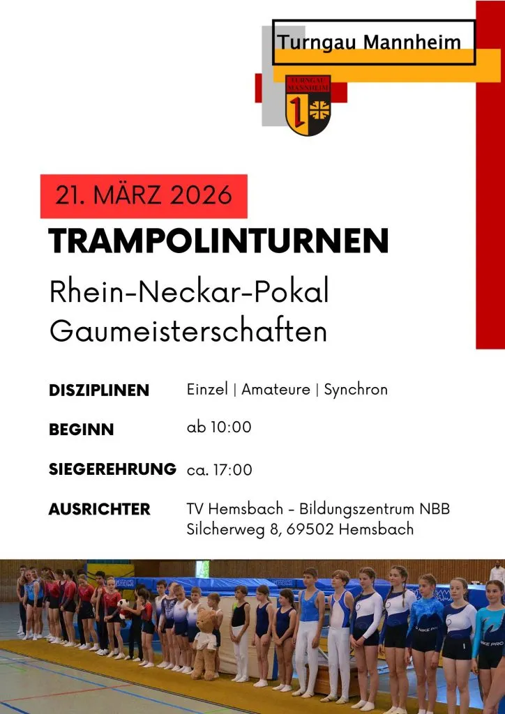 Am 21. März 2026 treffen sich Trampolinturner:innen aus der Metropolregion Rhein-Neckar in Hemsbach zum Wettkampf. Der diesjährige Ausrichter, der TV Hemsbach, empfängt den TSV Mannheim und die TSG Wiesloch zu den alljährlichen Gaumeisterschaften der Turngaue Heidelberg und Mannheim im Trampolinturnen. Zum Rhein-Neckar-Pokal sind außerdem Aktive aus Nachbarvereinen der drei Bundesländer in der Metropolregion Rhein-Neckar eingeladen.